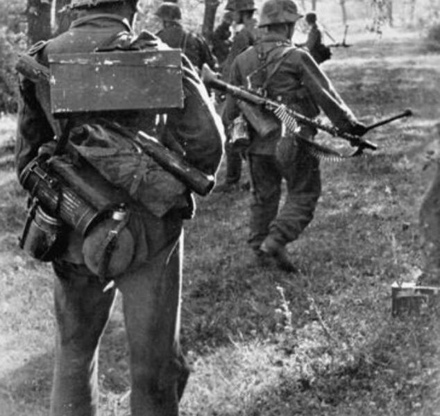 Auf dem Foto sind Soldaten der Wehrmacht mit MG-42-Munitionsgurten um den Hals während der Schlacht um die Normandie (1944) zu sehen.