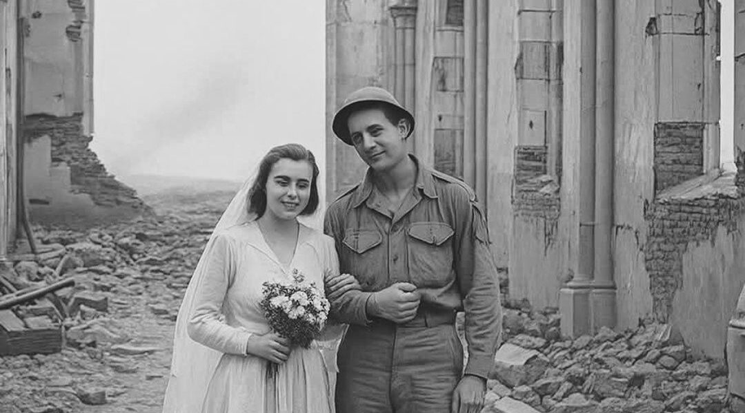 Normandie, 1944. Au loin résonnaient encore les canons. Sous les arcs brisés d’une église bombardée, parmi les pierres noircies, un petit mariage avait lieu. Pas de tapis de roses, pas d’orchestre ni de carillons ; seulement deux jeunes gens, les yeux plongés l’un dans l’autre, et un bouquet de marguerites frémissantes dans les mains de la mariée.