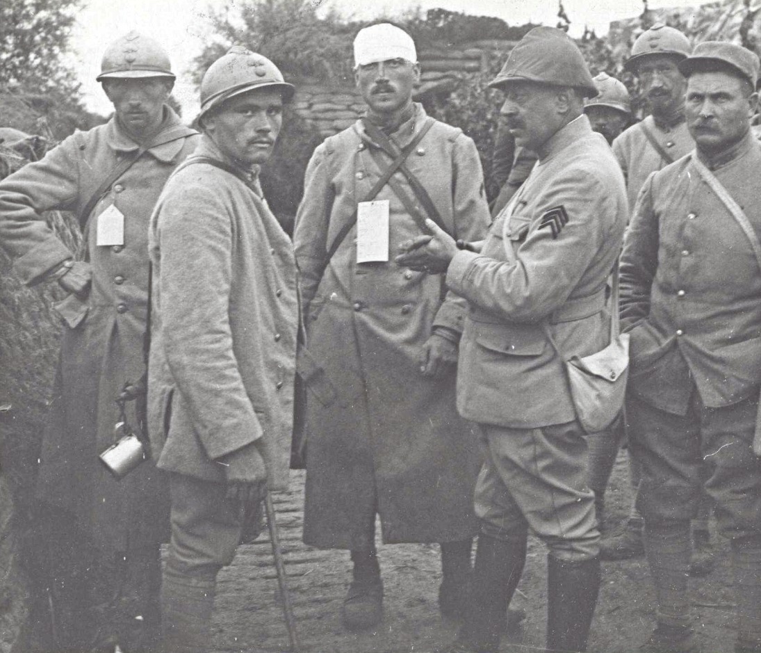 Une photo prise à la “ferme Raymond” près de la frontière belge en juillet 1917. Des blessés français arrivent au poste de commandement de brigade.