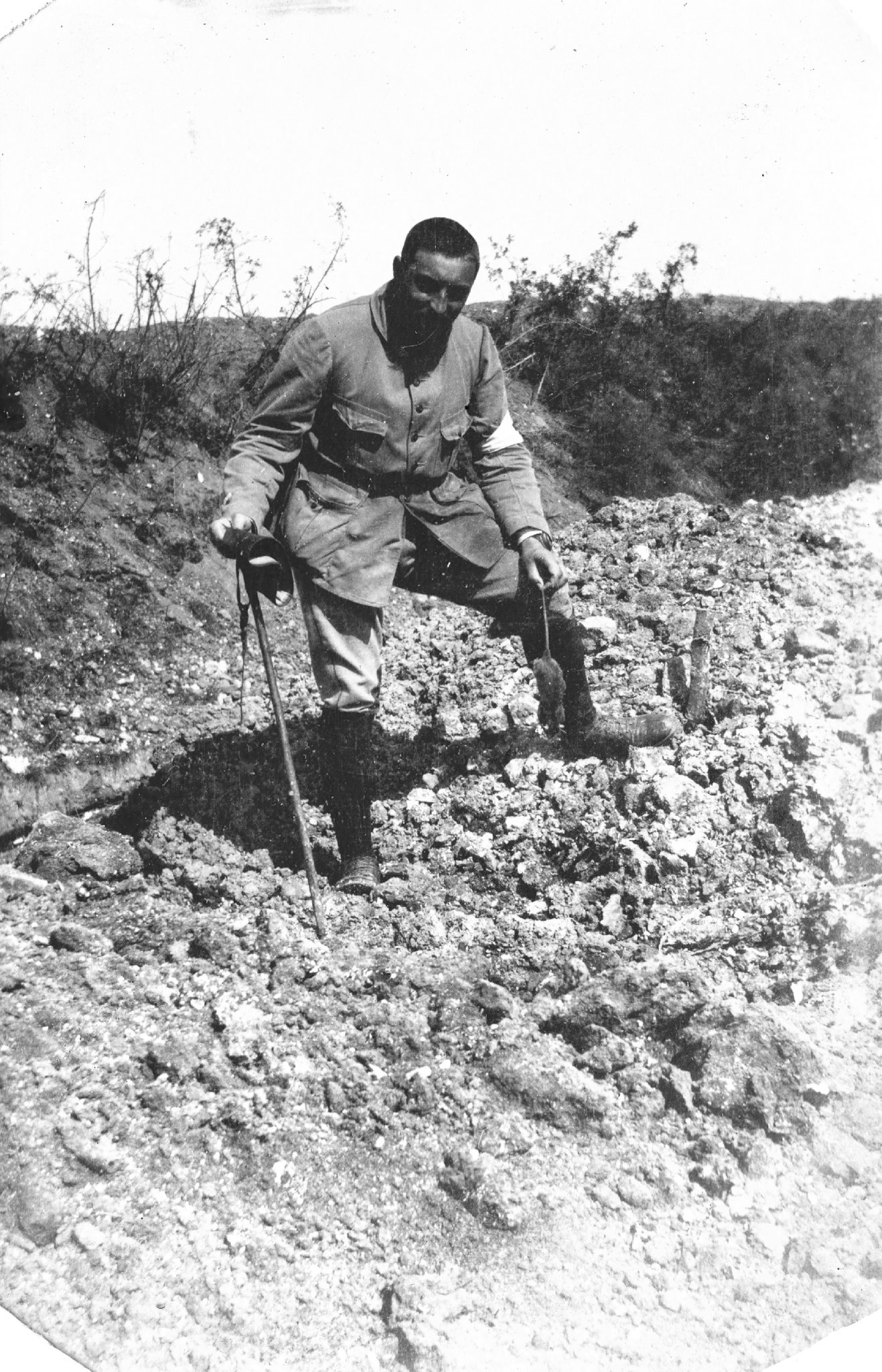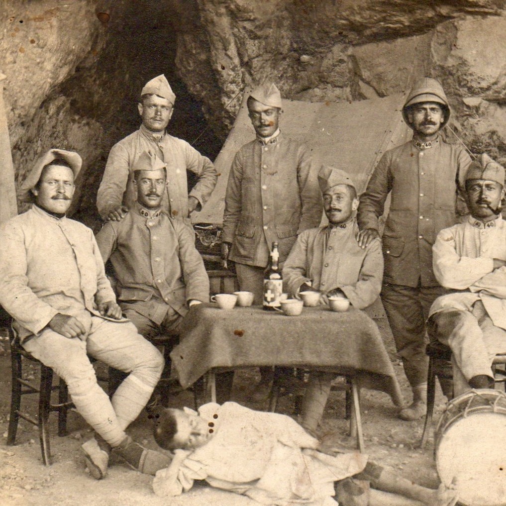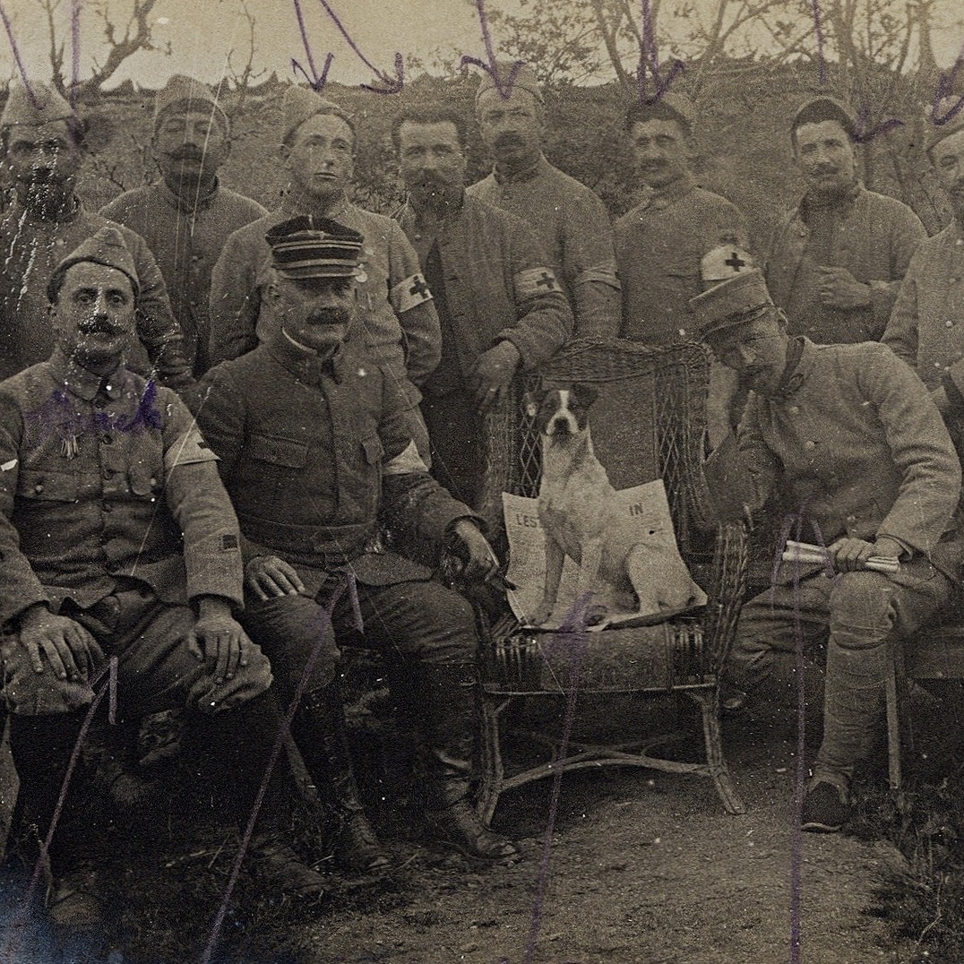 Alfred Perego et ses camarades brancardiers et infirmiers sont photographiés avec la “mascotte” du groupe en avril 1916. Pendant des mois, à la nuit tombante, ils se sont guidés au son, ils ont entendu les plaintes, les gémissements des blessés et ont repéré l’homme qui attendait dans les ténèbres. Ils l’ont porté sur le dos, sur un brancard, ou bien l’ont traîné sur une toile de tente, tant bien que mal, pour l’amener au Poste de secours.