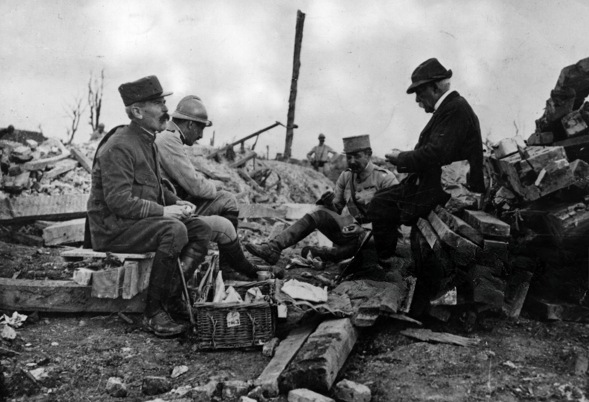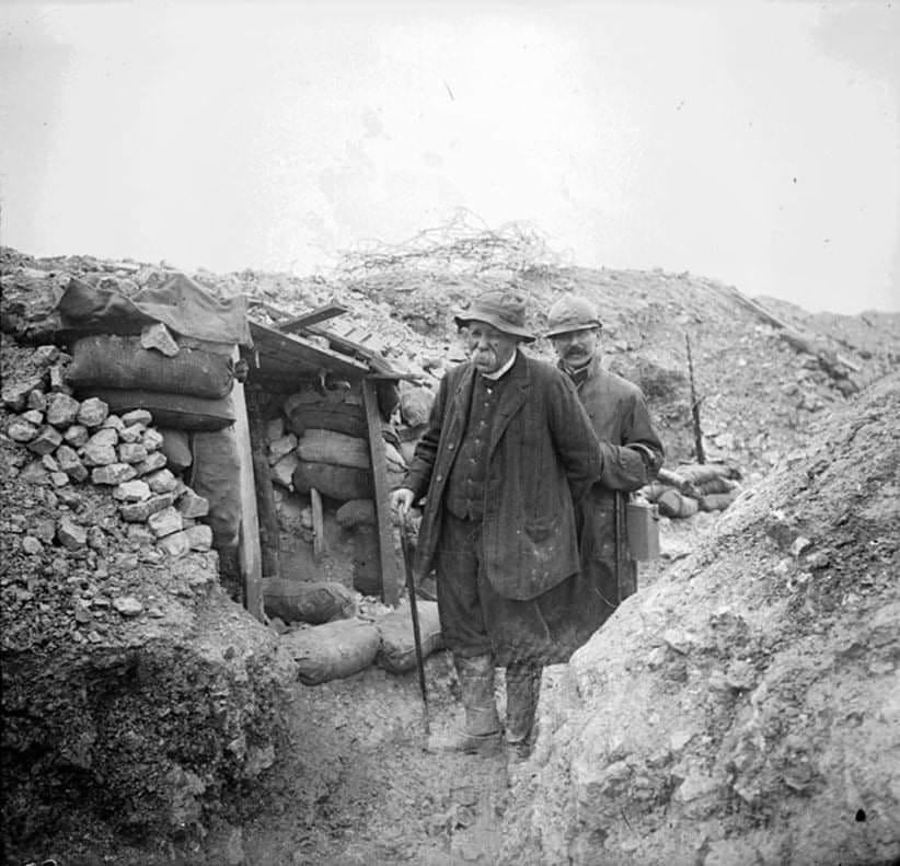 Le président du conseil Georges Clemenceau, alors âgé de 76 ans, visite une tranchée à Verdun en 1917. Le “Tigre” est à l’époque un partisan farouche d’une victoire totale sur l’Allemagne. On raconte qu’il monta sur le parapet pour hurler en direction des positions ennemies: « Cochons ! Salauds ! On vous aura à la fin ! »