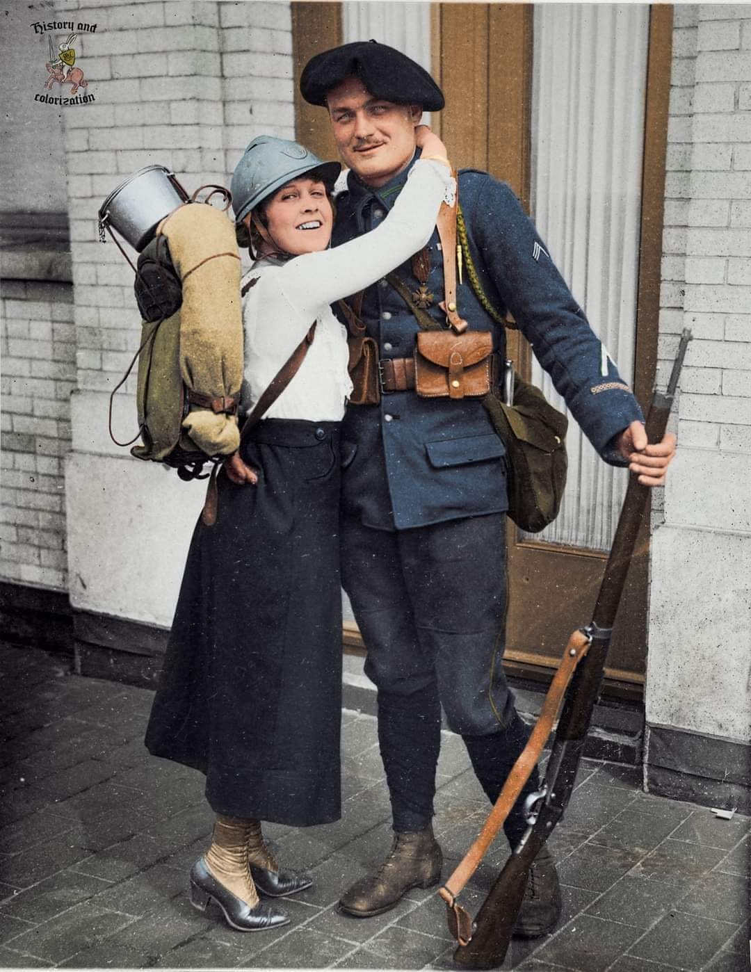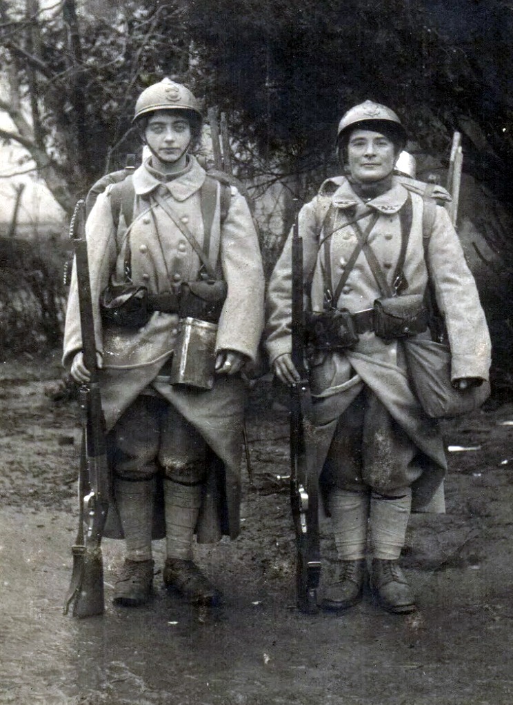 Ces deux femmes se sont “déguisées” en soldat français en 1916 ou 1917. A quelle occasion ? Un moment léger pour conjurer le sort. Un frère, un mari ou un père s’apprête à partir au front et n’en reviendra peut-être pas.