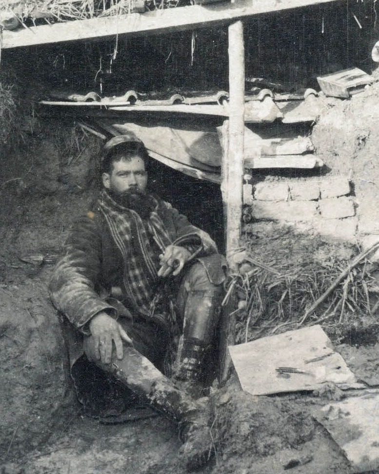 Un soldat français couvert de boue fume sa pipe dans une tranchée dans le nord de la France. Probablement en 1915.
