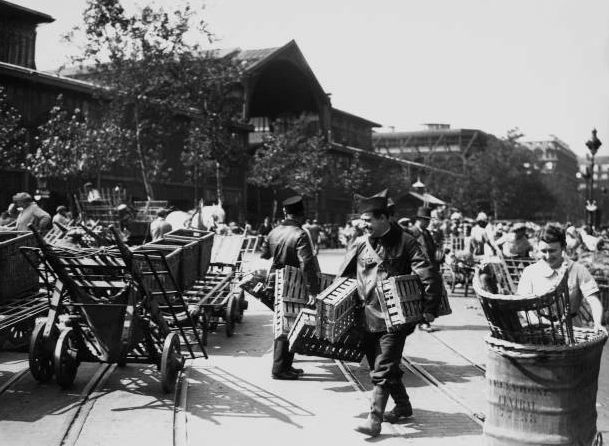 Paris, années 1930 — Porteurs des Halles transportant des cageots sur des chariots, devant un pavillon en fer et verre. La vie urbaine à la veille de la guerre.
