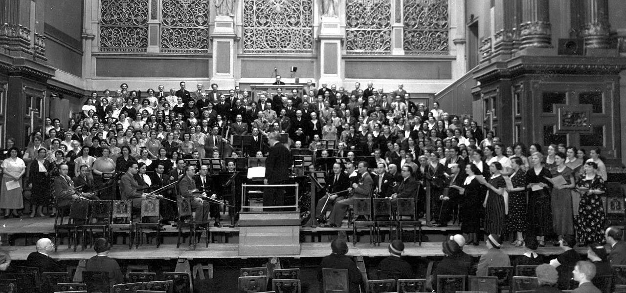 Das gezeigte Foto zeigt eine Probe eines großen deutschen Orchesters, begleitet von einem beeindruckenden Chor. Viele der Musiker und Sänger hatten während des Krieges gelitten – einige waren verwundet, andere hatten Angehörige verloren oder kamen gerade erst aus der Gefangenschaft zurück. Doch in diesem Moment verband sie alle ein gemeinsames Ziel: die Wiedergeburt der Musik in einem zerstörten Land.