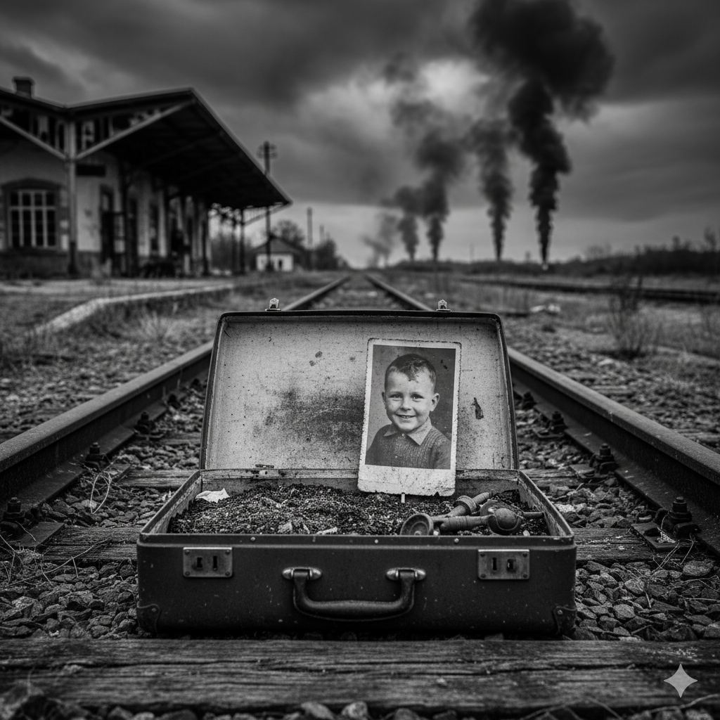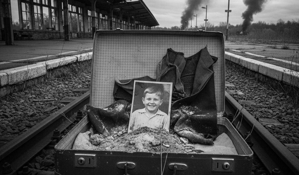 2. L’Écho de la Destruction : La Voie Ferrée Abandonnée Cinq ans plus tard, alors que le bruit des armes s’était tu et que la fumée de la guerre commençait à se dissiper, un employé de la Croix-Rouge trouva cette même valise. Elle gisait au milieu d’un tas de décombres, à l’extérieur d’une gare déserte, sur des rails envahis par les mauvaises herbes – ce qui était autrefois une artère de vie n’était plus que le témoin silencieux de la mort et de la séparation. Notre première image dépeint précisément cette scène. La valise est ouverte, les vêtements ont disparu, ne restent que des cendres et la photographie.