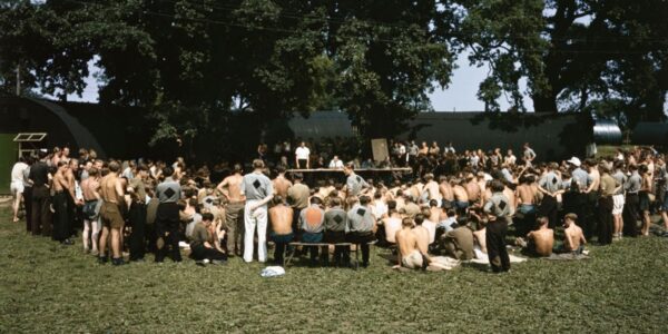 Eine Gruppe deutscher Kriegsgefangener der Klasse C mit vermutlich nationalsozialistischer Gesinnung nimmt im August 1947 an einer Brain-Trust-Debatte in einem Umerziehungslager für „schwarze Nazis“ aus dem Zweiten Weltkrieg in Wimbish, Essex, England, teil. Das schwarze Symbol auf der Rückseite ihrer…