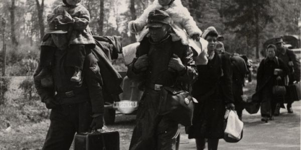 Flucht im Schatten des Krieges: Deutsche Soldaten tragen Kinder auf dem Rückzug – ein bewegender Moment aus den letzten Kriegstagen.H