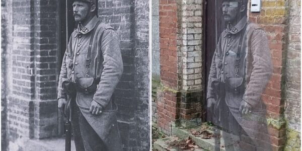 C M4-4 minutes Voir plus Time Capsule Un factionnaire monte la garde à l’entrée du quartier général français, sur l’actuelle Rue du Four à Marœuil, près d’Arras, en France — 1915 (Première Guerre mondiale) et 2025 (superposition) Un soldat français…