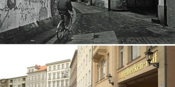 Berlin ist eine Stadt, die in jeder Mauer, jedem Stein und jeder Straße ihre Geschichte atmet. Das Bild oben zeigt eine eindrucksvolle „Damals-und-heute“-Perspektive: dieselbe Straße, derselbe Blickwinkel, doch zwei vollkommen verschiedene Welten. Auf dem oberen Bild radelt ein Mann an…