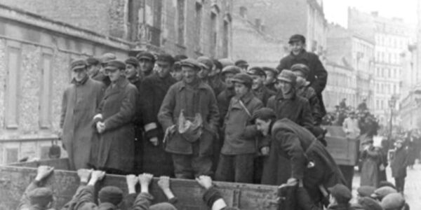 Die historische Aufnahme aus dem von Deutschland besetzten Warschau zeigt einen Augenblick, der für viele Menschen während des Zweiten Weltkriegs Realität war: junge jüdische Männer, von der Besatzungsmacht zusammengetrieben, werden auf Lastwagen verladen und zur Zwangsarbeit abgeführt. Dieses Bild mag…