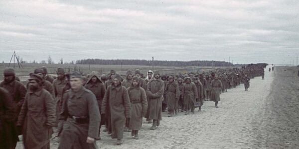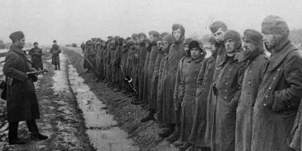 Das Schwarzweißfoto zeigt eine lange Reihe deutscher Soldaten, dicht nebeneinander aufgestellt, die Hände in den Manteltaschen, die Gesichter ernst, müde und ausdruckslos. Vor ihnen steht ein bewaffneter Wachposten. Der Boden ist aufgeweicht, der Himmel grau, die Landschaft wirkt leer und…