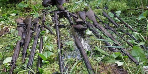 Sensationeller Grabungsfund in Deutschland: Verrostete Waffen aus dem Zweiten Weltkrieg im Wald von Brandenburg, Nähe Potsdam – Sommer 2024 entdeckt.H