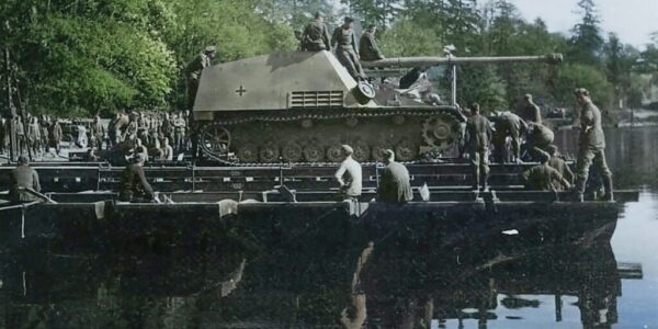 Seltene Aufnahme: Die deutsche 8,8-cm-Pak 43/1 Hornisse auf einer Fähre – Ein technisches Meisterwerk des Zweiten Weltkriegs! H
