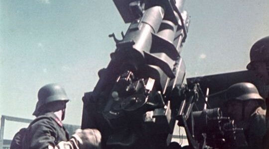 Das Bild zeigt eine Szene, die im Jahr 1944 an vielen Fronten des Zweiten Weltkriegs zur täglichen Realität gehörte: Eine deutsche Geschützmannschaft lädt eine 88-mm-Granate in eine Flak 18, die auf hohe Elevation ausgerichtet ist. Was auf den ersten Blick…