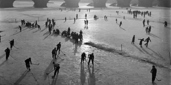 Berlin friert – Menschen gleiten über die zugefrorene Spree und vergessen für einen Moment den Alltag (Winter 1947).H