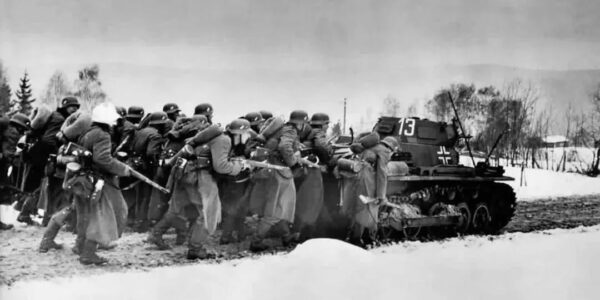 Das vorliegende Schwarzweißfoto zeigt eine Szene, die sinnbildlich für den Krieg an der Ostfront steht: Eine Gruppe deutscher Soldaten stemmt sich im tiefen Schnee gegen einen festgefahrenen Panzer. Die Landschaft ist karg, der Boden gefroren, die Bäume kahl. Es ist…