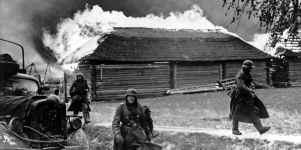 Das Bild zeigt einen Moment, der sinnbildlich für unzählige Orte in Europa während des Zweiten Weltkriegs steht. Ein brennendes Dorf, einfache Holzhäuser in Flammen, Soldaten bewegen sich durch eine Landschaft, die innerhalb weniger Stunden ihre vertraute Ordnung verloren hat. Solche…