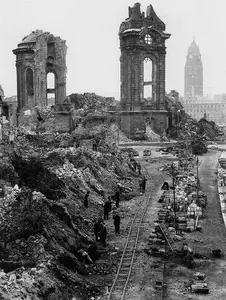 Der Kölner Dom ragt hoch über den Ruinen der Stadt nach den Bombenangriffen der Alliierten im Jahr 1944 empor.H