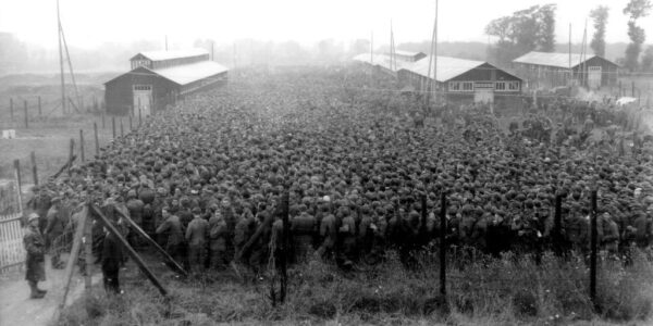 Die hier gezeigte Fotografie, aufgenommen im Spätsommer 1944, zeigt ein eindrucksvolles und zugleich bedrückendes Bild: Hunderte deutsche Kriegsgefangene sind dicht gedrängt in einem provisorischen Gefangenenlager bei Nonant-le-Pin in der Normandie versammelt. Nur wenige Tage zuvor hatten alliierte Truppen im sogenannten…