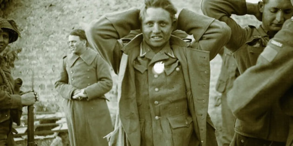 Das Foto zeigt einen Moment, der auf den ersten Blick unscheinbar wirkt – und doch eine enorme historische Tiefe besitzt. Ein deutscher Soldat des Jahres 1944 steht im Mittelpunkt. Die Hände hinter dem Kopf, der Blick direkt in die Kamera…