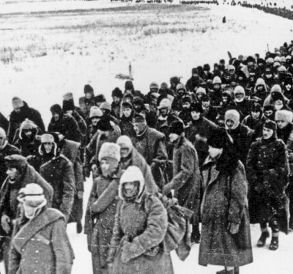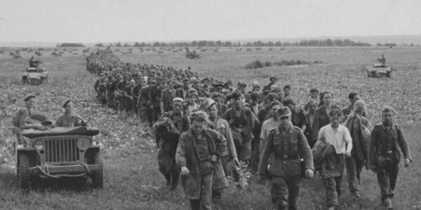 Das Schwarz-Weiß-Foto zeigt eine lange Kolonne erschöpfter Soldaten, bewacht von alliierten Fahrzeugen, die sich durch ein weites Feld bewegt. Diese Szene steht stellvertretend für ein Kapitel des Zweiten Weltkriegs, das häufig im Schatten großer Schlachten steht: die massenhafte Gefangennahme deutscher…
