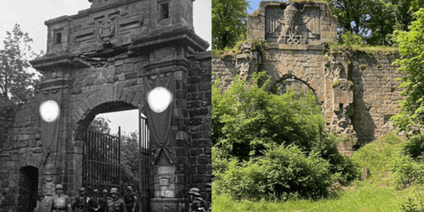 Das nebeneinander gestellte Bild zeigt auf der linken Seite ein historisches Foto aus den 1930er- oder 1940er-Jahren: ein steinernes Tor, geschmückt mit mächtigen Reichsadlern und einschüchternden Bannern, flankiert von uniformierten Soldaten. Auf der rechten Seite sehen wir den gleichen Ort…