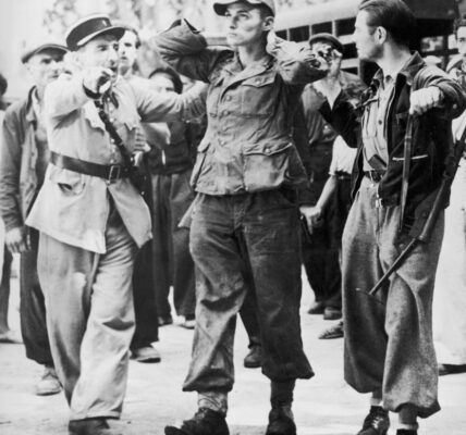 Das Foto entstand im Jahr 1943 an der Ostfront, einem der grausamsten und verlustreichsten Kriegsschauplätze des Zweiten Weltkriegs. Es zeigt einen verwundeten deutschen Soldaten, der von zwei Kameraden gestützt wird. Sein Gesicht ist gezeichnet von Schmerz und Erschöpfung, eine Zigarette…