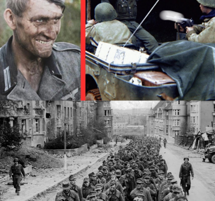 Ein Augenblick der Kapitulation: Wenn der Krieg sein Ende findet Das Foto zeigt einen Moment, der auf den ersten Blick unspektakulär wirkt und doch eine enorme historische Bedeutung trägt. Deutsche Soldaten gehen mit erhobenen Händen durch eine zerstörte Straße. Ihre…