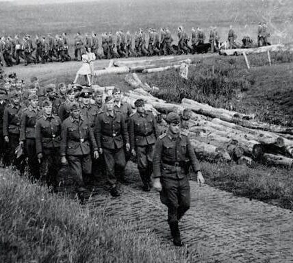 Die hier gezeigte Aufnahme gehört zu den Bildern, die uns einen seltenen, ungefilterten Blick auf die Realität des Kriegsalltags geben. Eine lange Kolonne deutscher Soldaten, eng aneinandergereiht auf Motorrädern und Seitenwagen, bewegt sich durch eine enge Straße. Die Uniformen sind…