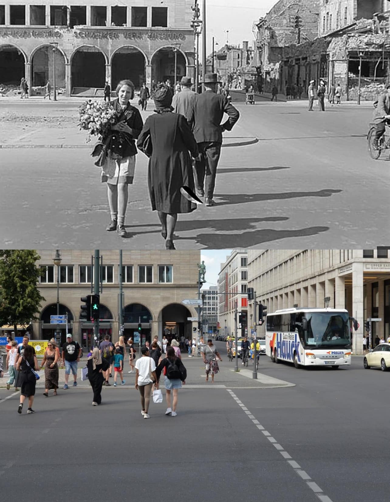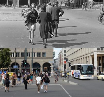 Mehr entdecken Time Capsule AirPort Time Capsule Berlin ist eine Stadt, die in jeder Mauer, jedem Stein und jeder Straße ihre Geschichte atmet. Das Bild oben zeigt eine eindrucksvolle „Damals-und-heute“-Perspektive: dieselbe Straße, derselbe Blickwinkel, doch zwei vollkommen verschiedene Welten….