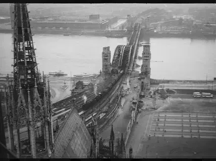 Berlin, Mitte der 1940er Jahre: Auf dem Dach des gewaltigen Zoo-Bunkers erhebt sich eine der beeindruckendsten Luftabwehranlagen des Zweiten Weltkriegs – die 12,8‑cm‑Doppelflak. Das Foto, aufgenommen vom britischen Fotografen Cecil F. S. Newman, zeigt den Blick nach Nordwesten, mit…