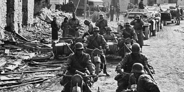 Das Foto zeigt eine Szene, die den Schrecken, aber auch die militärische Realität des Zweiten Weltkriegs deutlich vor Augen führt: eine Kolonne deutscher Kradschützen, also motorisierter Infanterieeinheiten auf Motorrädern mit Beiwagen, rollt durch die Trümmer einer zerstörten Stadt. Die Häuser,…