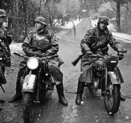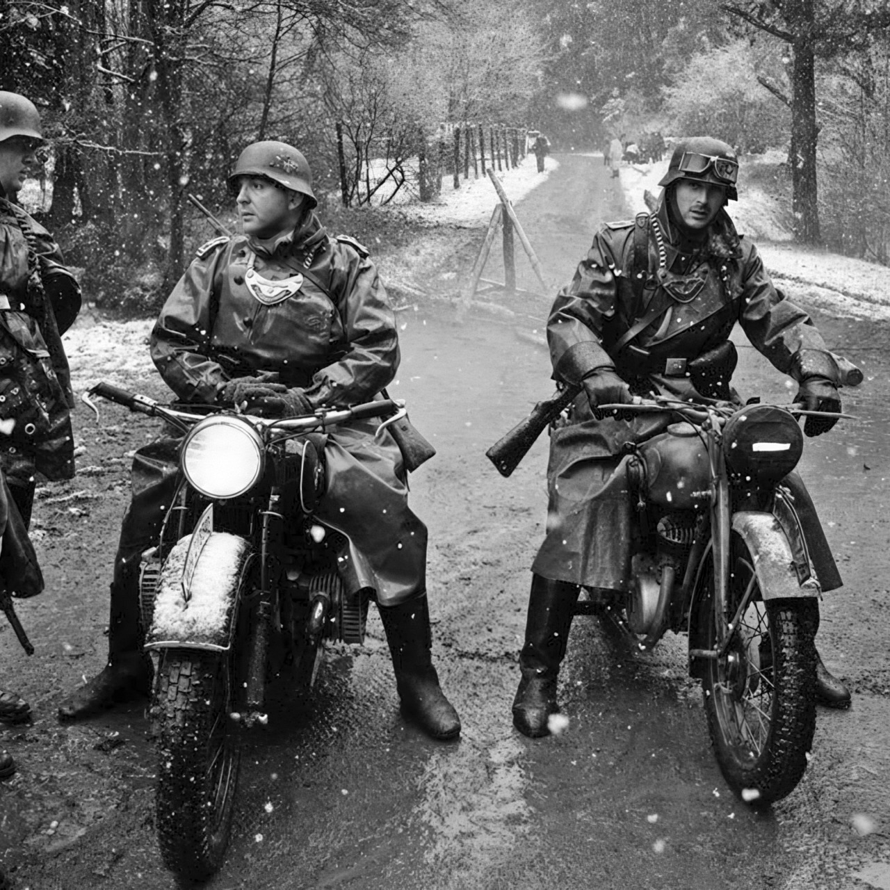 Das Foto zeigt eine Szene, die den Schrecken, aber auch die militärische Realität des Zweiten Weltkriegs deutlich vor Augen führt: eine Kolonne deutscher Kradschützen, also motorisierter Infanterieeinheiten auf Motorrädern mit Beiwagen, rollt durch die Trümmer einer zerstörten Stadt. Die Häuser,…