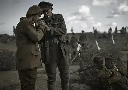 Britische Verwundete und deutscher Kriegsgefangener teilen eine Zigarette – Schlacht von Épehy, 18. September 1918.H