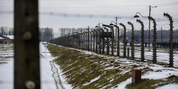 Eine Teilansicht der Zäune des ehemaligen NS-Vernichtungslagers Birkenau. Die Erinnerung an den Holocaust Tag findet am 27. Januar, wo die Überlebenden der 74. Jahrestag der Befreiung von Auschwitz Feierlichkeiten teilnehmen wird. Einen allgemeinen Überblick über die Zäune der ehemaligen…
