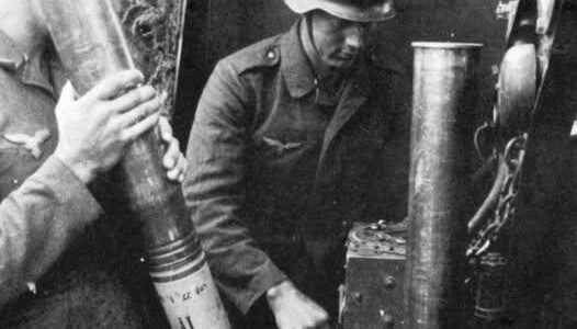 Das Bild zeigt ein deutsches FlaK-Team im Zweiten Weltkrieg, das ein Geschoss in den Zünderstellbecher einlegt. Diese Vorrichtung, ein automatischer Zündersteller, war ein bemerkenswertes technisches Detail, das den Einsatz der legendären 8,8 cm FlaK-Geschütze noch effizienter machte. Doch hinter dieser…