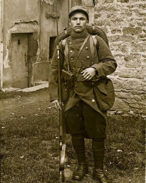Philibert Calais, jeune artilleur de 22 ans, sur le front de Champagne en 1917. Il porte son casque Adrian sous le bras.