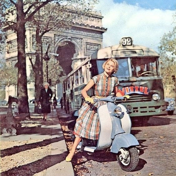 Jeune femme sur sa Lambretta devant l’Arc de Triomphe et le bus 92. 1957. Paris