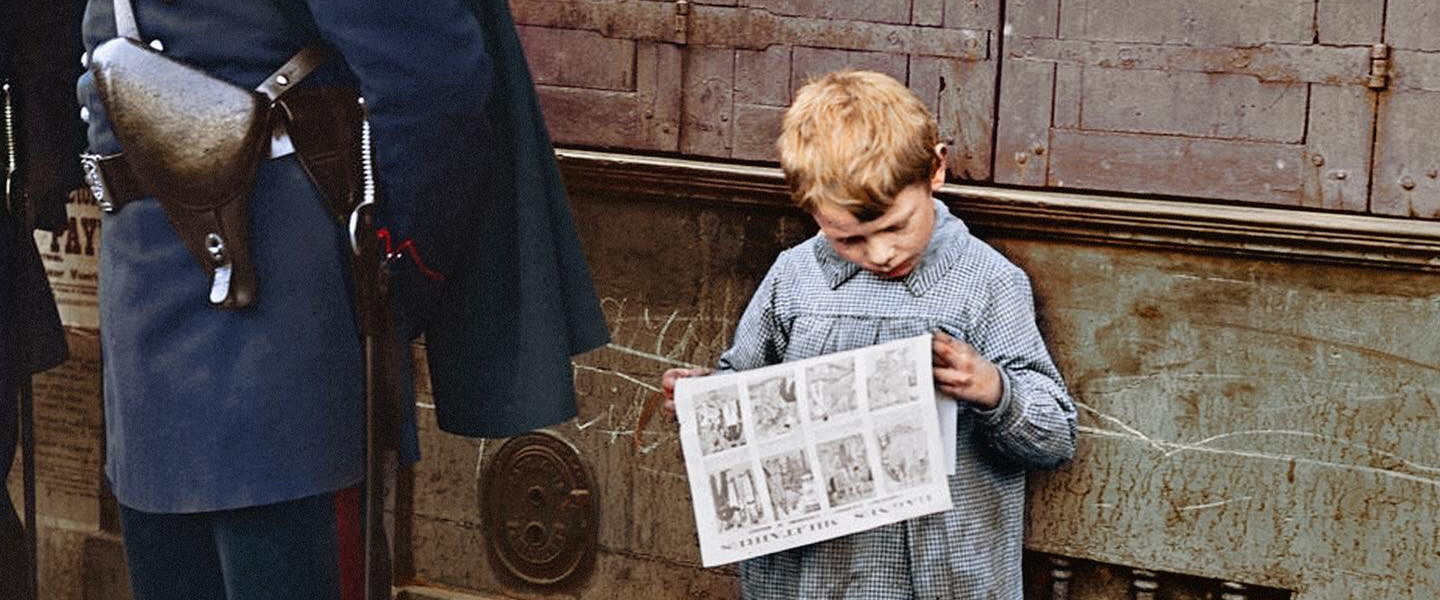 Un enfant lit un journal à côté d’un policier à Paris (France), le 1er mai 1912. Image colorisée par @sebcolorisation sur Instagram.