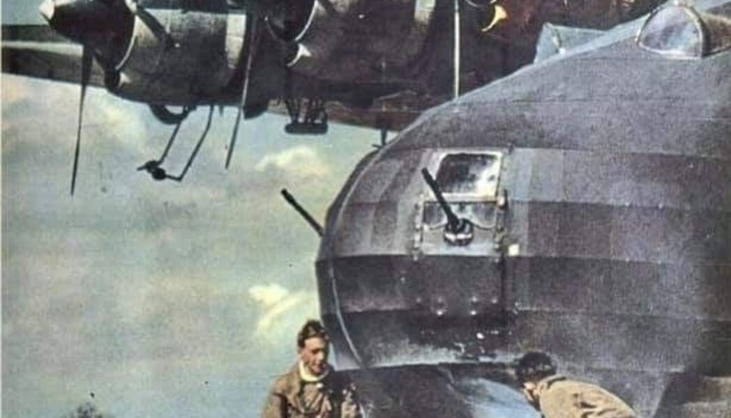 Dieses seltene Farbfoto aus dem Jahr 1944 zeigt einen stillen Moment zwischen Technik, Disziplin und menschlicher Anspannung. Zwei Angehörige der deutschen Luftwaffe stehen neben einem mächtigen Flugzeug – einem Langstreckenbomber, der zu jener Zeit zu den modernsten Maschinen der Welt gehörte. Der Aufnahme gelingt etwas Außergewöhnliches: Sie fängt nicht die Gewalt des Krieges ein, sondern einen Augenblick der Vorbereitung, des Wartens – bevor der Himmel erneut von Motoren und Rauch erfüllt wird.