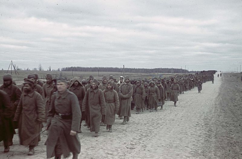 Die Ostfront war besonders geprägt von extremen Bedingungen. Schlammige Straßen, zerstörte Infrastruktur und wechselhafte Witterung machten jede Bewegung zur Belastung. Der Marsch im Foto wirkt endlos – die Kolonne verliert sich am Horizont. Dieses Motiv verstärkt den Eindruck von Ausweglosigkeit und Dauer. Es ist kein klarer Anfang und kein sichtbares Ende erkennbar, nur Bewegung.