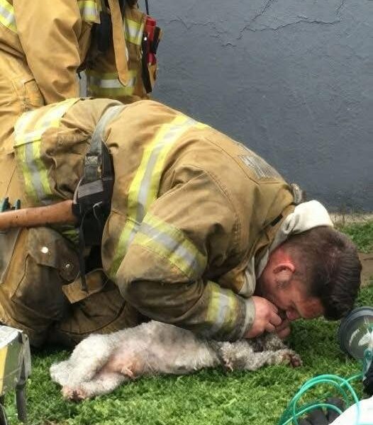 Un groupe courageux de pompiers a sauvé un chien sans vie d’un incendie dévastateur, en lui prodiguant un massage cardiaque (du bouche au museau) pour le ramener à la vie après l’avoir sorti des flammes.H