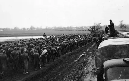 Auf dem Foto nehmen deutsche Soldaten eine weiße Fahne von sich ergebenden französischen Soldaten entgegen (1940).