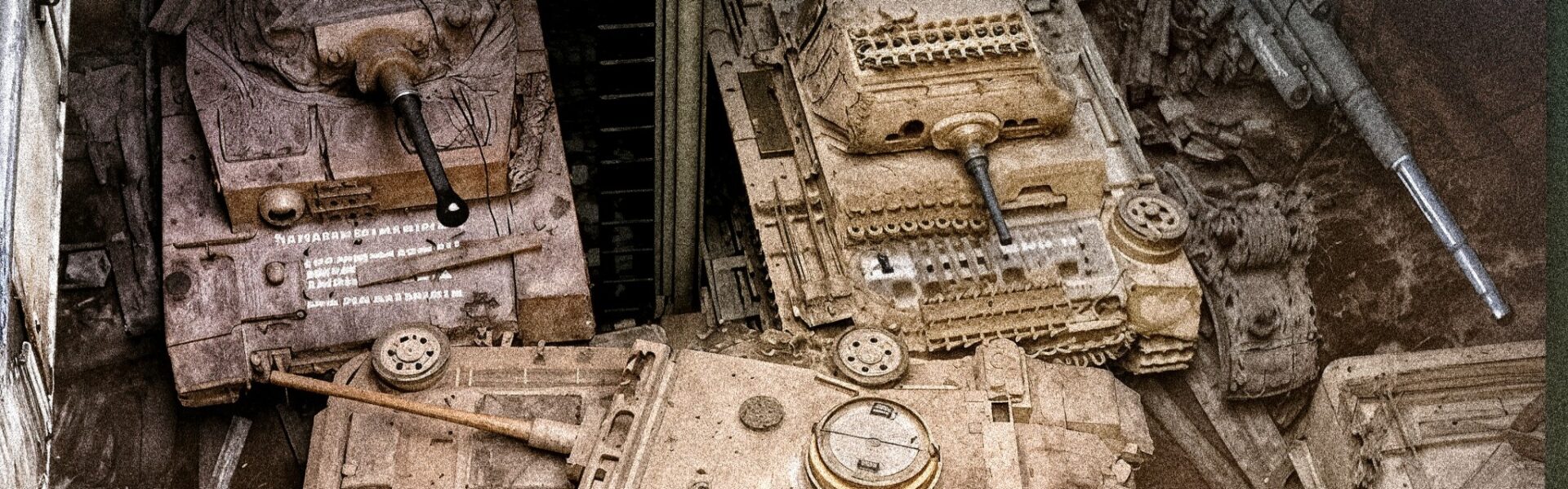 Die Panzer, die wir auf diesem Bild sehen, haben diese Zeit jedoch längst überdauert. Sie sind keine Werkzeuge der Macht mehr, sondern Relikte, die von Rost und Verfall gezeichnet sind. Ihre Rohre, einst furchteinflößend, wirken heute wie stumme Metallröhren. Die einst präzise gefertigten Ketten liegen schwer und unbeweglich am Boden. Man erkennt deutlich, wie die Zeit ihre Spuren hinterlassen hat: Staub, Schmutz und Verfall dominieren das Bild.