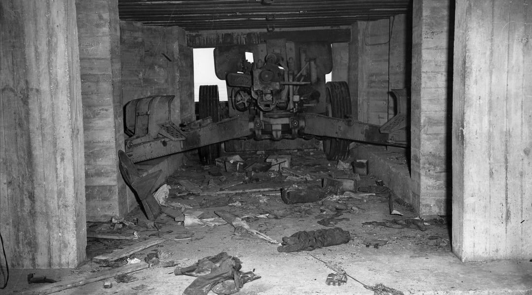 Wenn man auf dieses historische Foto blickt, scheint die Zeit für einen Moment stillzustehen. Die Aufnahme zeigt eine verlassene deutsche Geschützstellung – ein massiver Betonraum, der einst Teil einer Verteidigungsstruktur war. In der Mitte steht eine schwere Kanone, zurückgelassen in einer Umgebung voller Trümmer, verstreuter Ausrüstung und chaotisch liegender Stoffreste. Keine Soldaten, keine Geräusche, kein Kriegslärm – nur die stille Präsenz eines Ortes, der einst für militärische Zwecke gebaut wurde und später hastig aufgegeben worden zu sein scheint. Solche Bilder besitzen eine besondere Wirkung: Sie eröffnen einen Blick in die letzten Tage der Kämpfe, in Momente der Flucht, Improvisation und des Zusammenbruchs militärischer Ordnung.