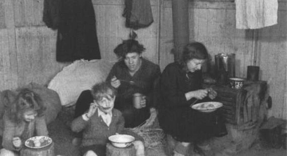 Das Foto zeigt eine dieser Familien. Eine einfache Hütte aus Holz, kaum Schutz vor der Kälte. Ein kleiner Ofen, der schwach glüht, ein paar Kleidungsstücke, die zum Trocknen hängen. Auf dem Boden Stroh, das als Bett dienen muss. Eine Frau sitzt am Ofen, das Gesicht müde, aber konzentriert – sie schneidet ein Stück Brot, vielleicht das Einzige, was sie heute zu essen haben. Neben ihr ein Junge, barfuß, mit einem Löffel in der Hand. Das Kind wirkt erschöpft, aber still. Daneben ein weiteres Mädchen, vielleicht seine Schwester, die ihre Mahlzeit vorsichtig isst, als wüsste sie, dass es nicht viel ist.