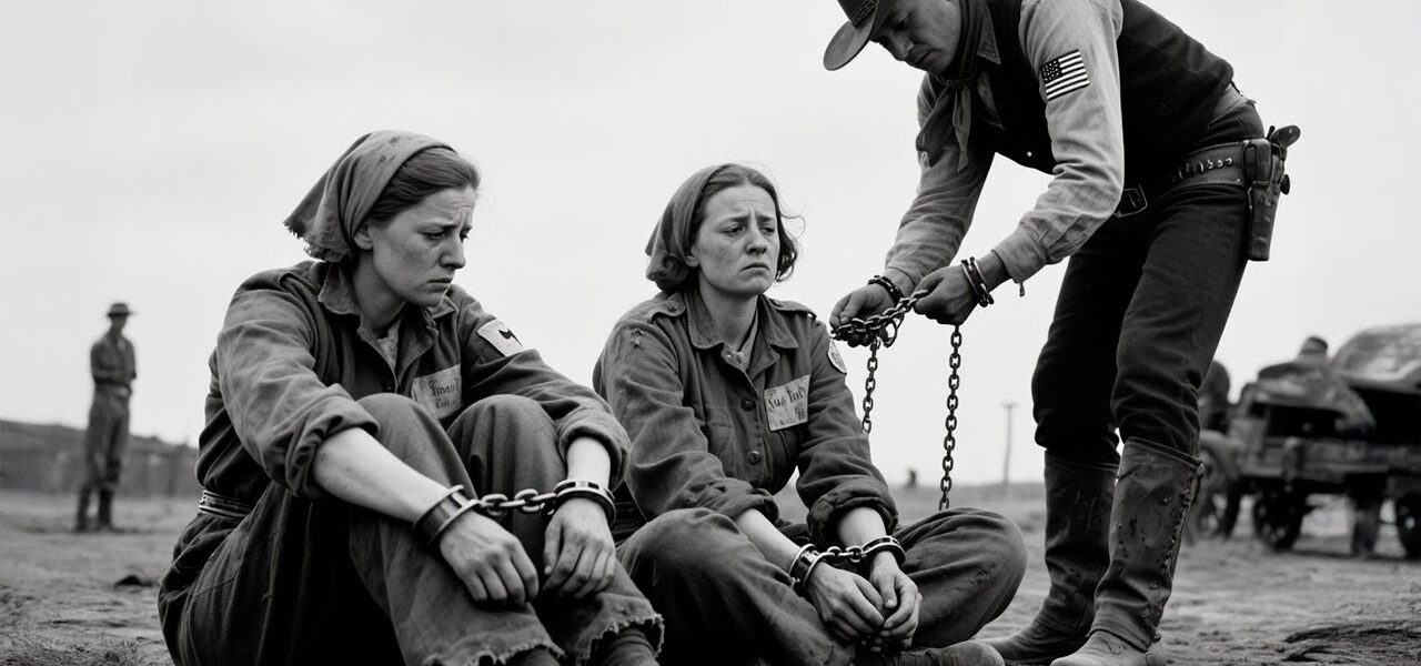 Texas, 1944. The sun sat high over Camp Hearne like a watchful eye that never blinked, bleaching the guard towers, hardening the dirt, and turning the wire fences into thin lines of fire. A dozen German women stood near the corral, bareheaded and silent, squinting into the glare. Their wrists were linked in groups of four, chain against skin, chain against bone, the metal worn smooth by weeks of movement and misery. They had expected this part to last. Chains were not just security; chains were a statement. They said: you are dangerous, you are defeated, you are no longer yourself.